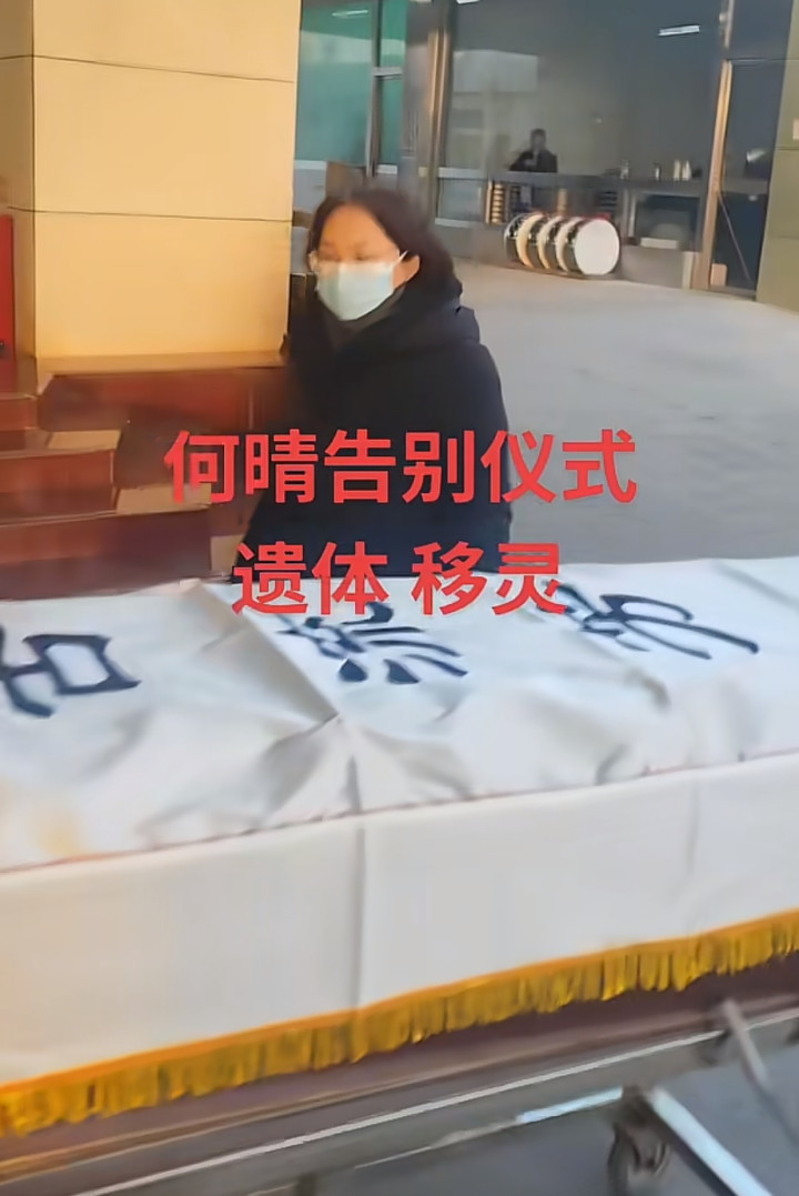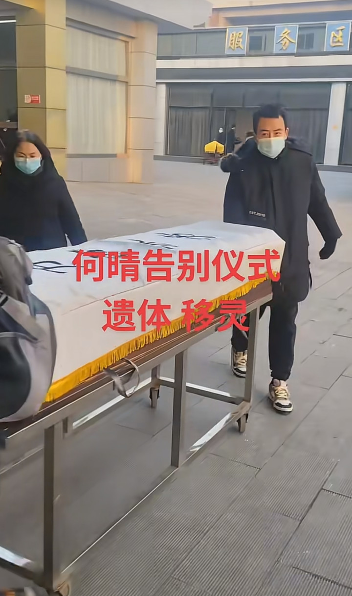 何晴的遗体入殓后,从入殓室送往灵堂,遗体移灵时就3个人,一个背着背包,戴着口罩的男人走在前面,拉着放灵柩的推车,另外一个个子很高,戴着口罩,长得和何晴儿子许何很像,但看年龄又比许何成熟的男子走在灵柩推车后面,推着推车。